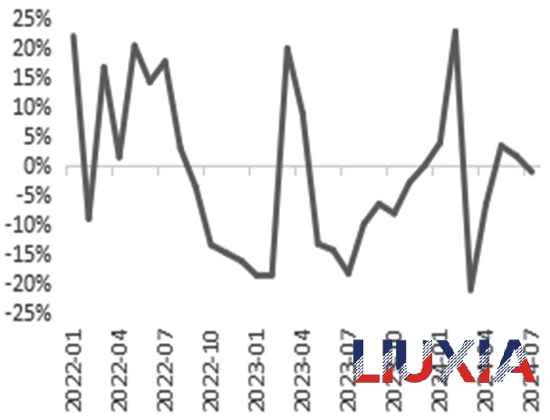 根据我国海关总署出口数据计算,今年1—7月,我国纺织服装出口额累计同比略增0.03%,较去年出口基本保持平稳,其中纺织纱线、织物及其制品同比增加2.54%,服装及衣着附件同比下降2.15%。按月来看,今年仅2月纺织服装出口同比增加22.53%,主要由于红海危机担忧引发的海外订单前置,阶段性的订单前移也导致3月出口数据基本同比例大幅回落,其余月份同比变化幅度相对较小,海外市场需求整体表现较为平稳,预期的补库周期尚未有明显体现。