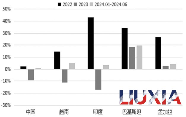 除了我国之外,全球纺织服装出口国主要集中在东南亚以及南亚地带,本文选取越南、印度、巴基斯坦以及孟加拉进行比对分析(巴基斯坦2024年数据为1—3月,孟加拉2024年数据为1—5月)。从近几年各国纺织服装出口增量变化情况来看,2022年全球纺织服装出口需求较好,同比均有明显增长,但2023年出口需求下降且资源向巴基斯坦和孟加拉有所转移。而从今年上半年的情况来看,各国同比有所好转,但幅度上不及2022年的表现,其中巴基斯坦因体量最小增幅更为明显,表明全球纺织服装需求在经济增速放缓下稳中略好,但订单向新兴纺织国家逐渐转移的趋势还在,其中不排除我国纺织产业链向海外市场转移所带来的影响。